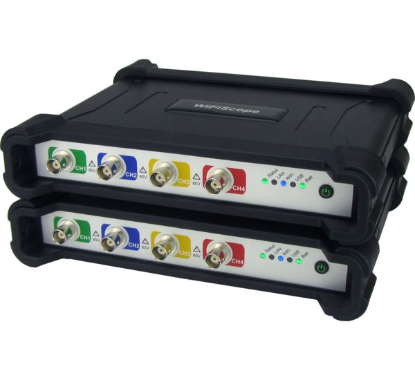 The MultiScope MSW8 is an 8 channel WiFi oscilloscope, created by combining and synchronizing two WiFiScope WS6s, using two Wireless Multi Instrument Synchronization Module WCMIs. All units will measure at the same sample frequency (0 ppm deviation!).